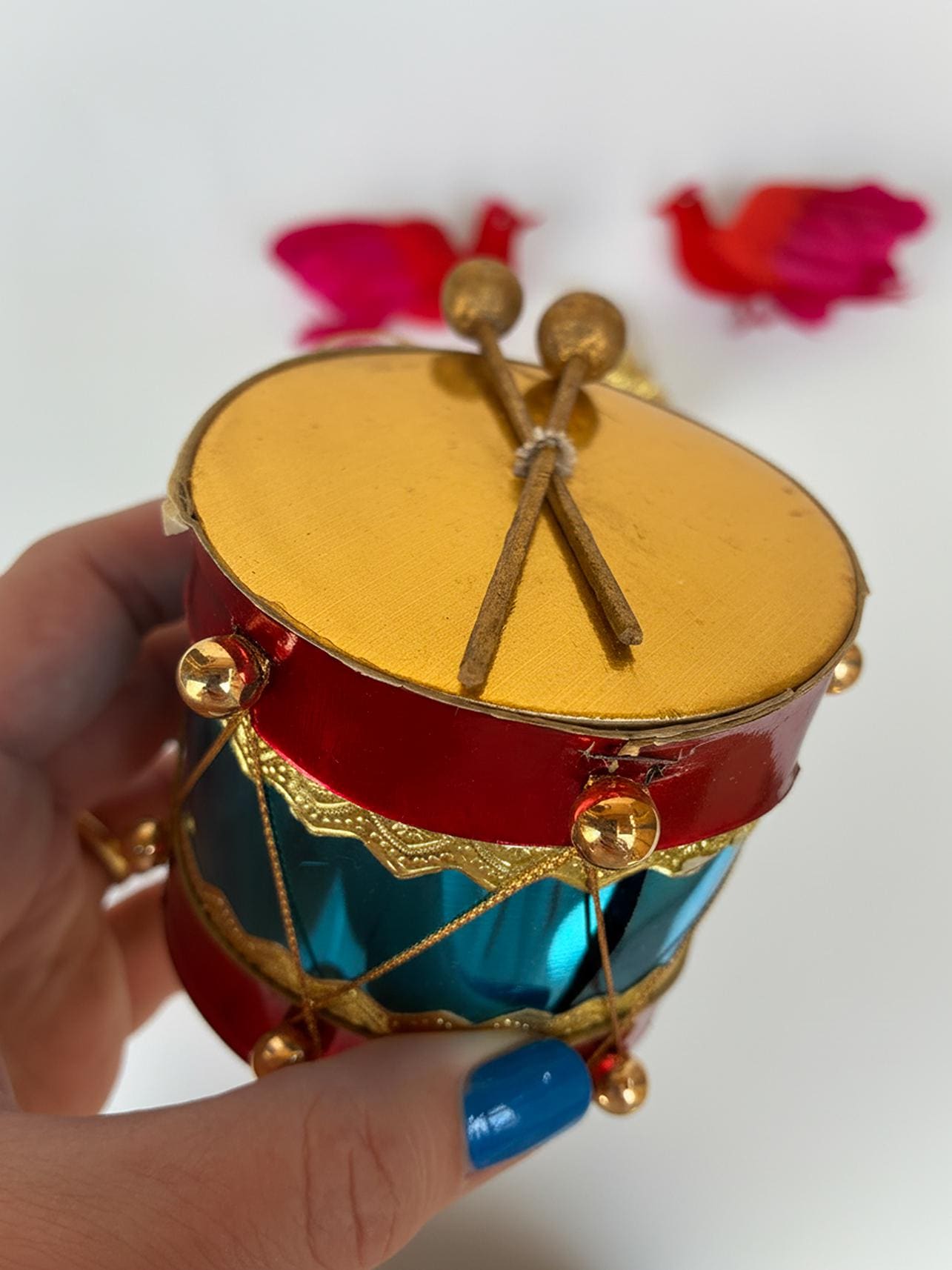 Gold metal tree with stone ornaments.4" tall, 3" wide. Paper drum 3" tall, 3" wide. Has ware.