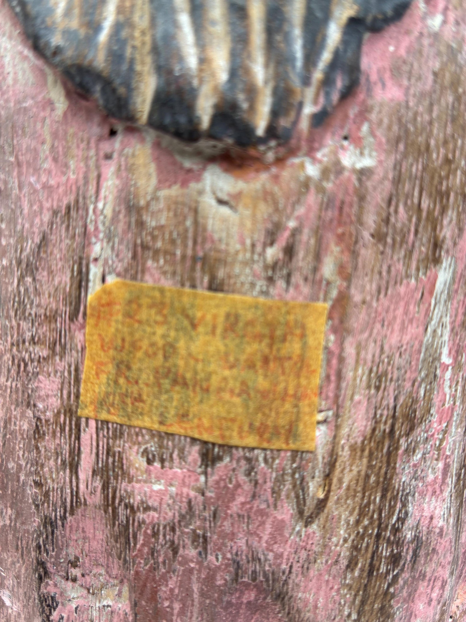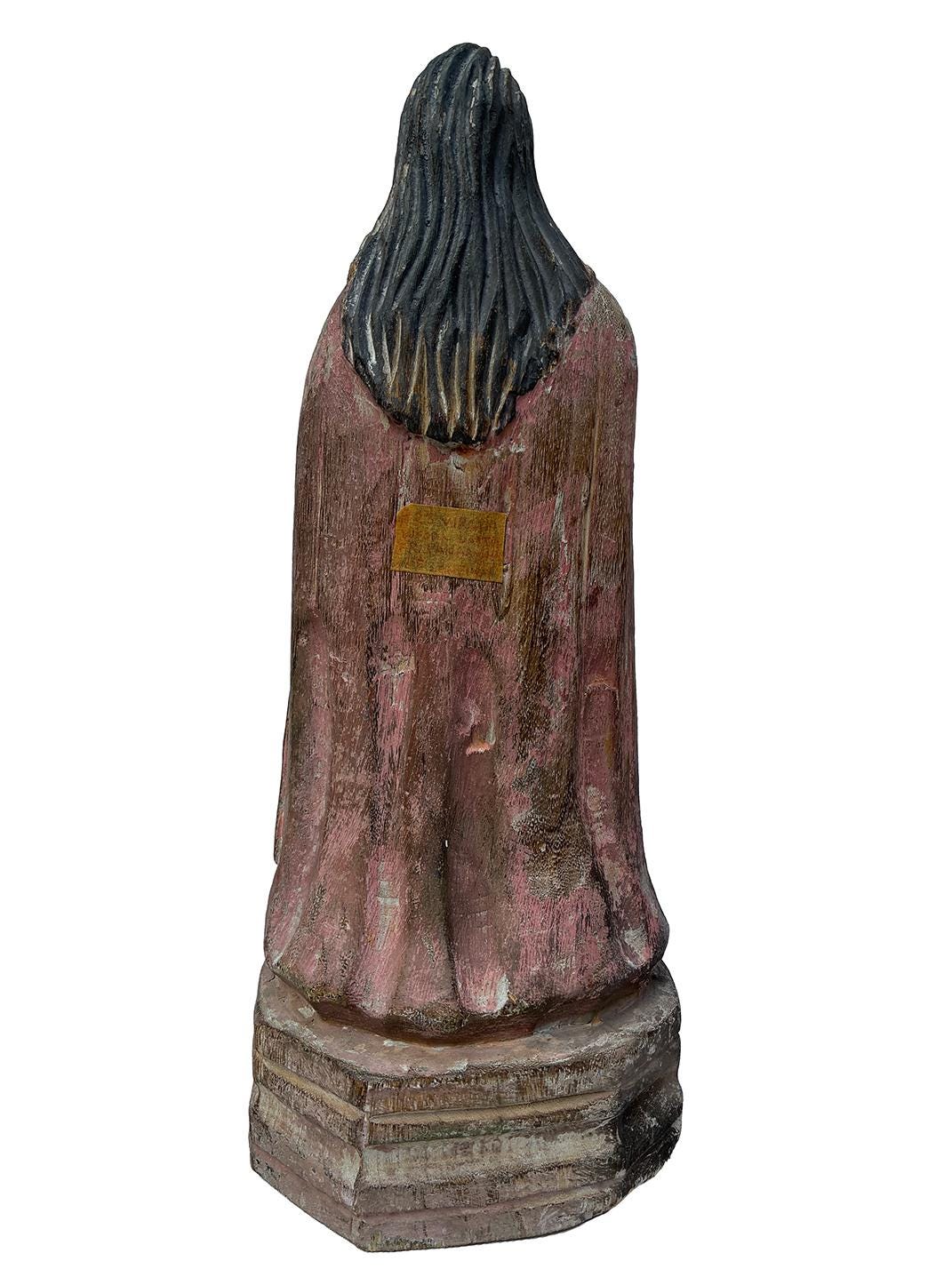 Hand-carved wooden statue of the Virgin Mary (santo), 12.5″ H × 5″ W × 5″ D. Retains original polychrome paint with attractive aged patina and surface wear consistent with age (see photos). A paper label on the back reads "Virgin - Panama / #23. Good display presence for an altar, shelf or folk-art collection. Sold as-is; insured shipping available.