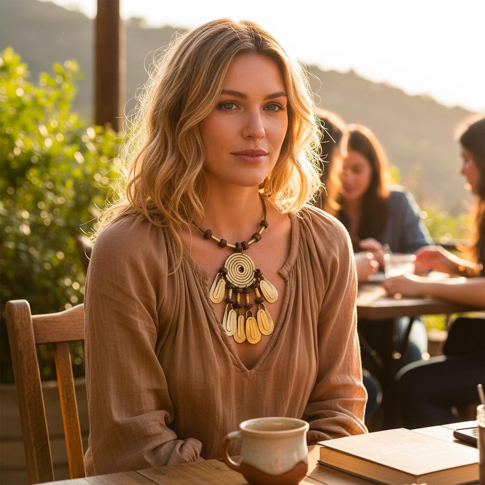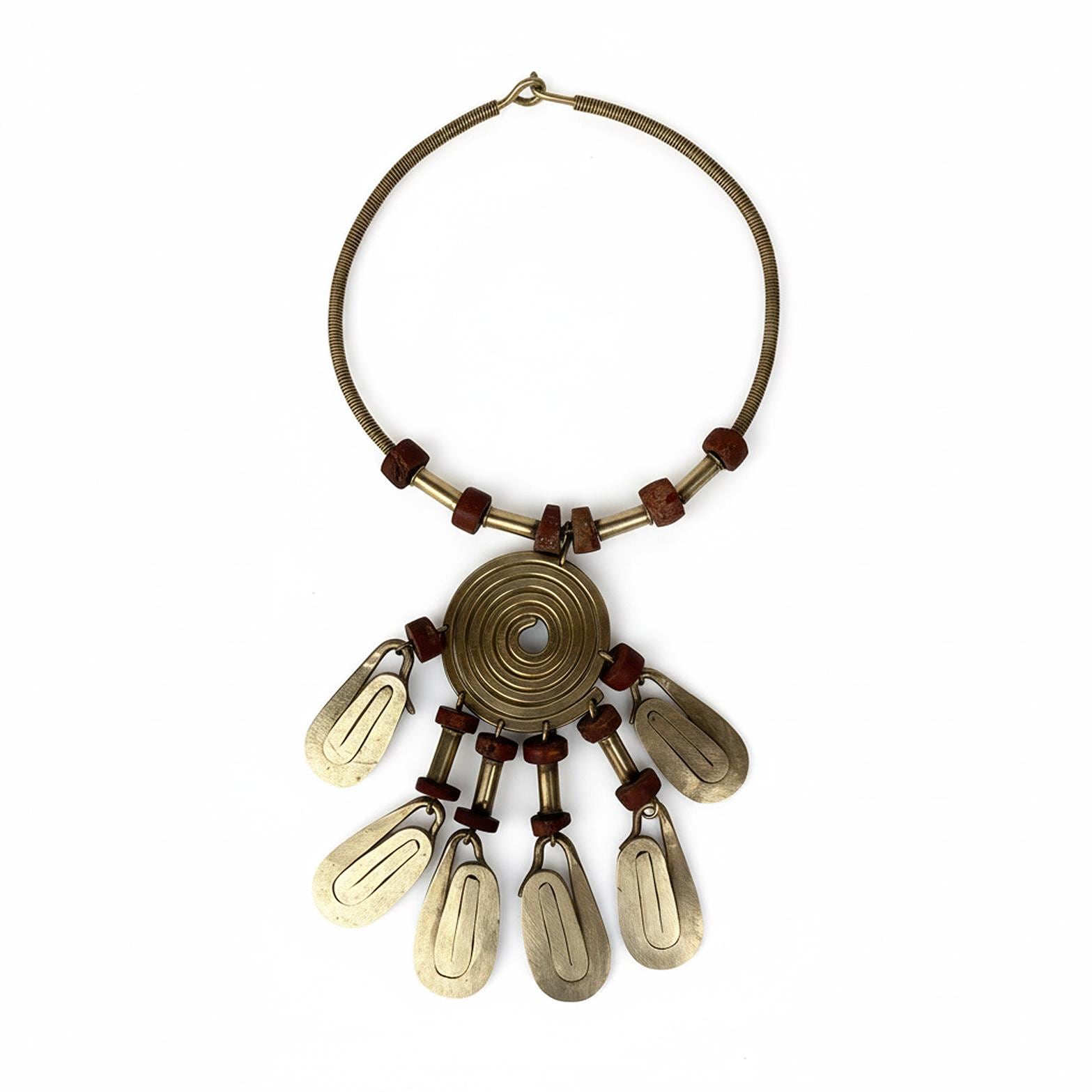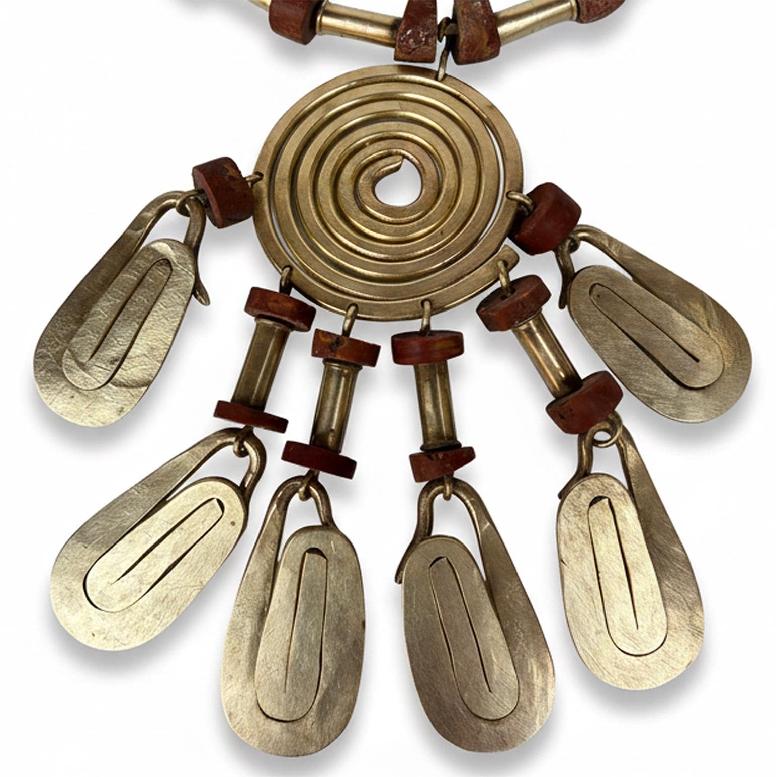 1960's beautifully hand crafted brass choker necklace with spiral design and red stone beads. Stunning piece. Authentic and in excellent condition. 10" top to bottom, 5" wide.