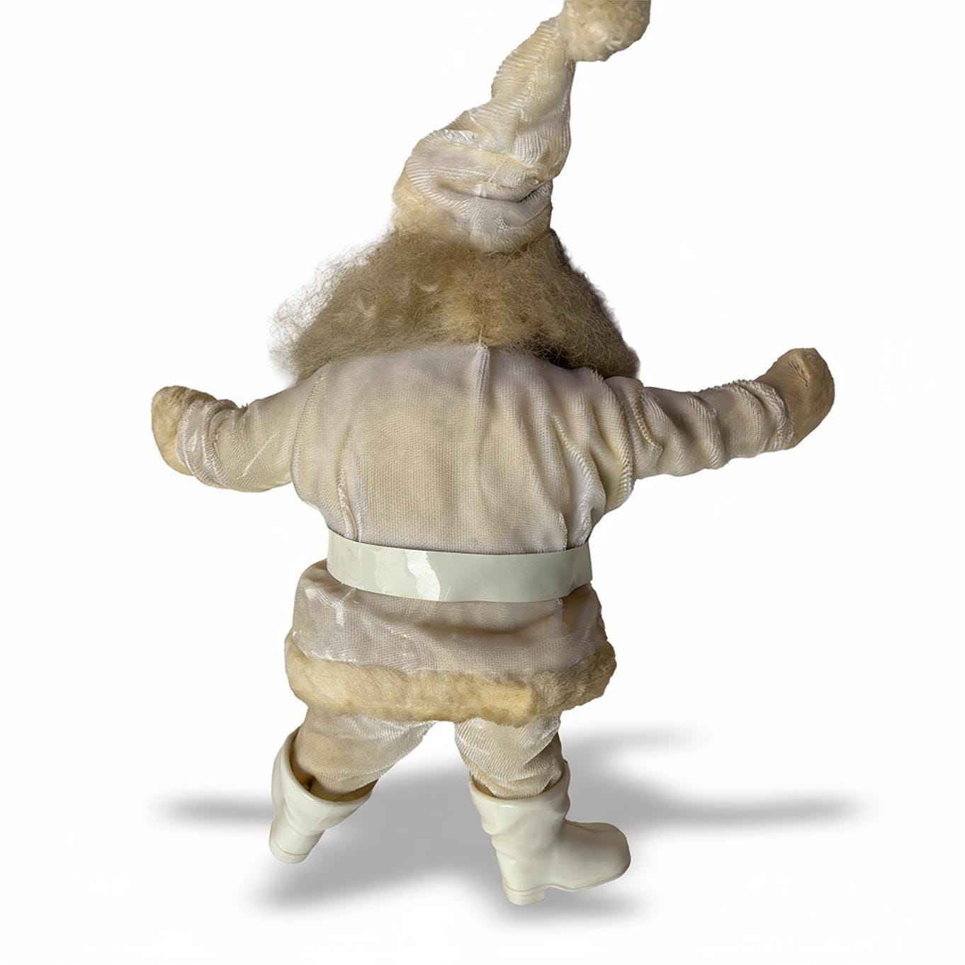 Wonderful Vintage Harold Gale Santa Claus in All White Velvet Costume, Mid Century Christmas Holiday Santa. Face very bright and cheery with pink cheeks and great condition eyes/ lips however his nose has a scratch. There is yellowing present to his costume and his boots are in great condition but no longer glued on. This Santa has tissue paper lining which is shown in pictures, Approx 1950s. His beard is a lovely ivory wool.