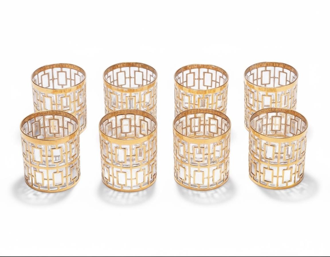 This set of 20 Imperial Glass Company glasses, 11 highball glasses and 9 low ball glasses in the Shoji pattern (designed for the Japanese screen!). They are arguably some of the most sought after pieces of 20th century barware, and each piece is stamped on the base of each glass, and remain in wonderful condition.