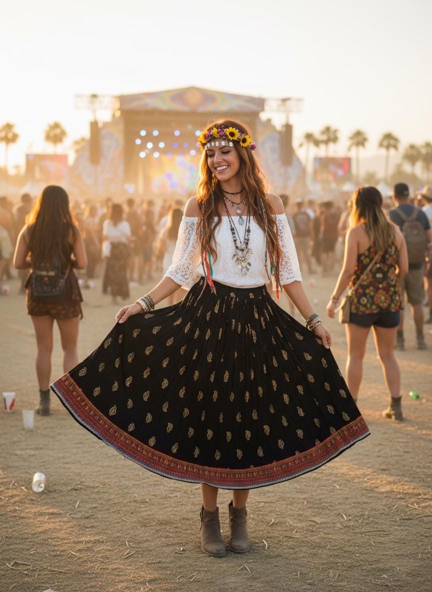 Gorgeous one size 100% Cotton full drawstring black broomstick skirt with a gold hand blocked paisley print, Pom pom tassels with mirror style and gold thread flowers adorning the bottom.