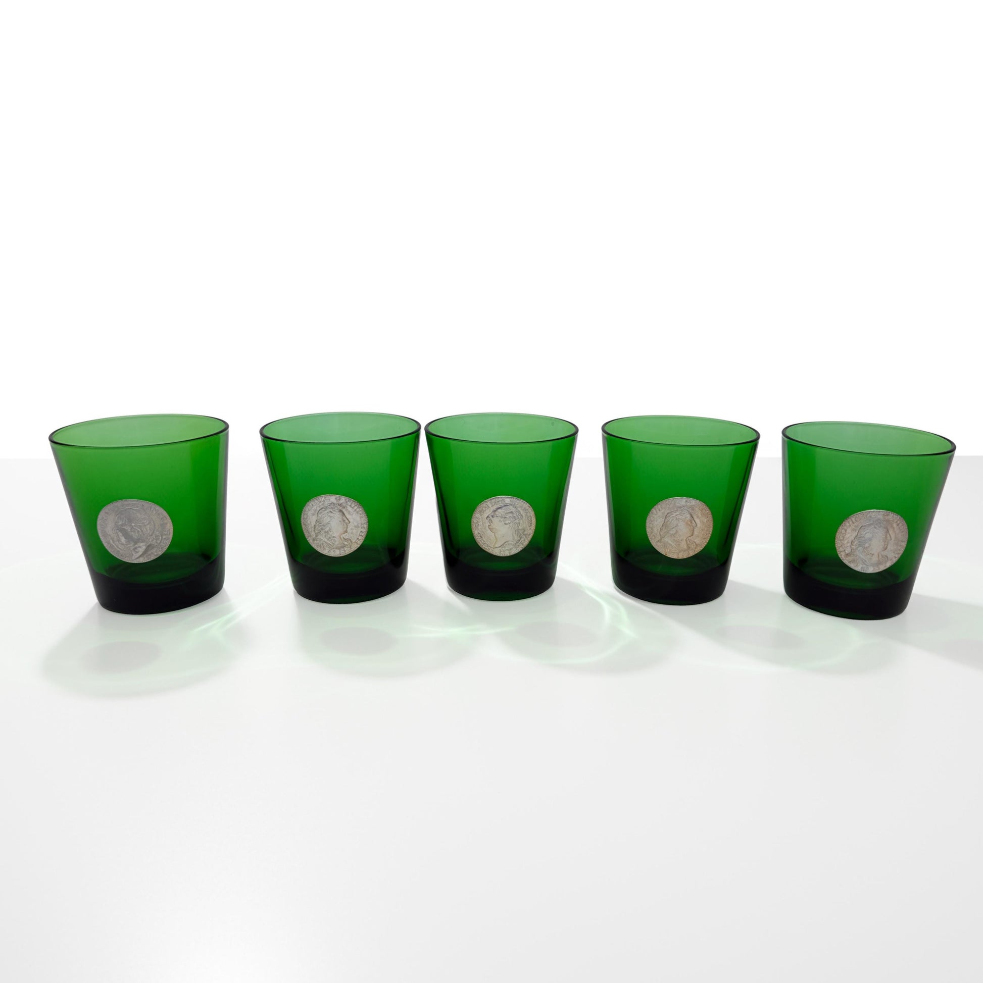 Mid Century Italian Green Glasses with Solver Medallion Faces of French Kings Made in Italy for Byrrh promotion Vermouth