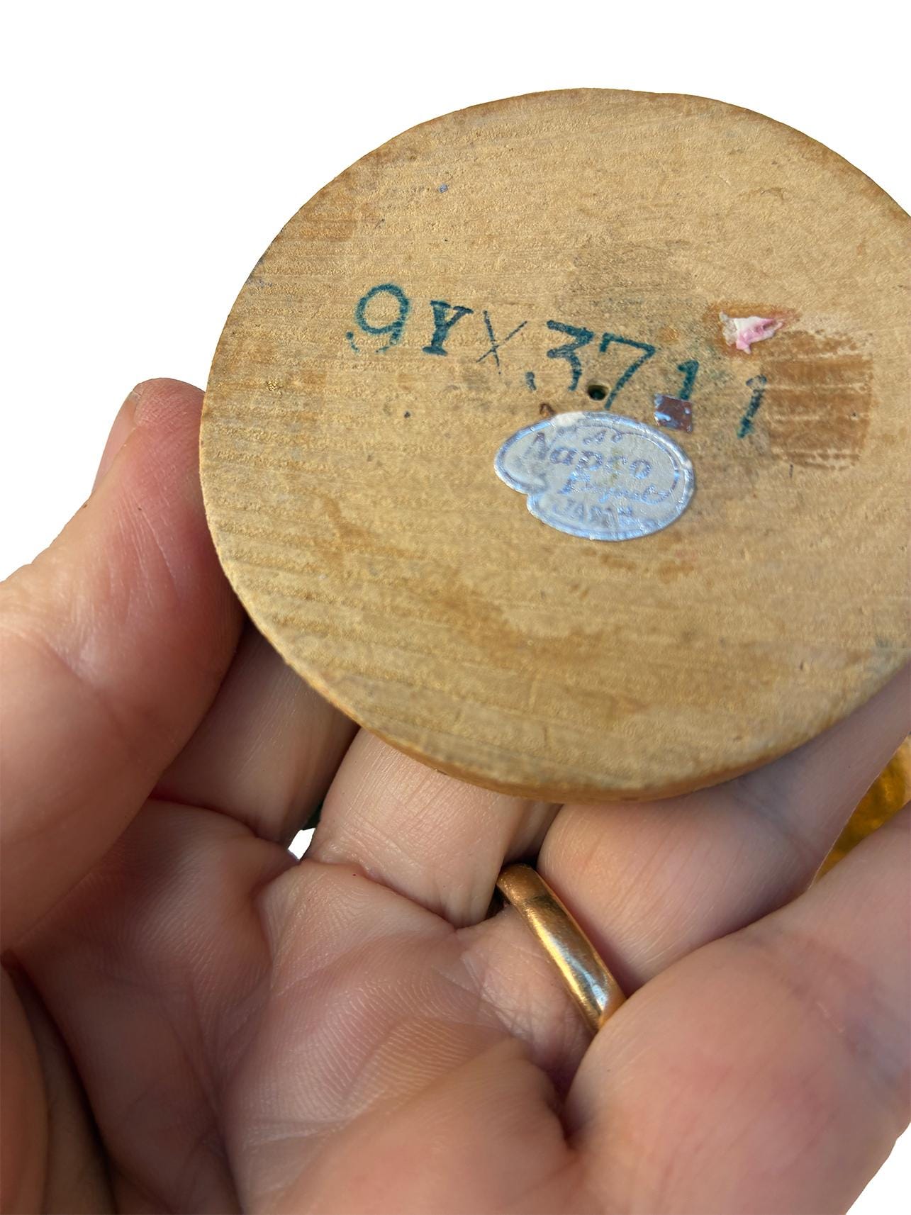 with the normal signs of wear from age and use: balls have considerable color loss and some tarnish, base gold paint is distressed.