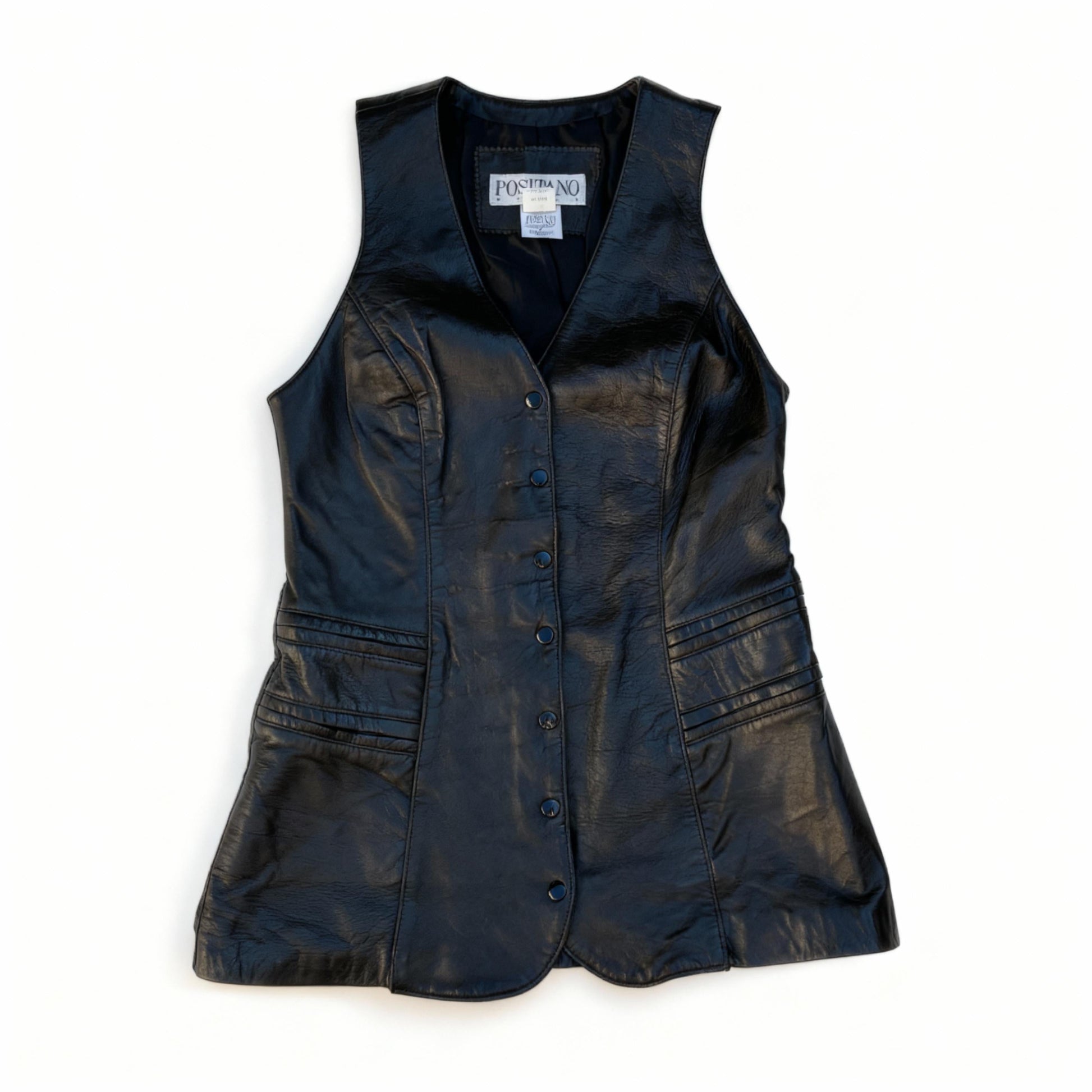 Beautiful black butter leather long V neck women's vest with snaps up front by Positano Pelle made in USA Kansas City. Size Petite. Absolutely gorgeous closet staple. Wonderful condition.