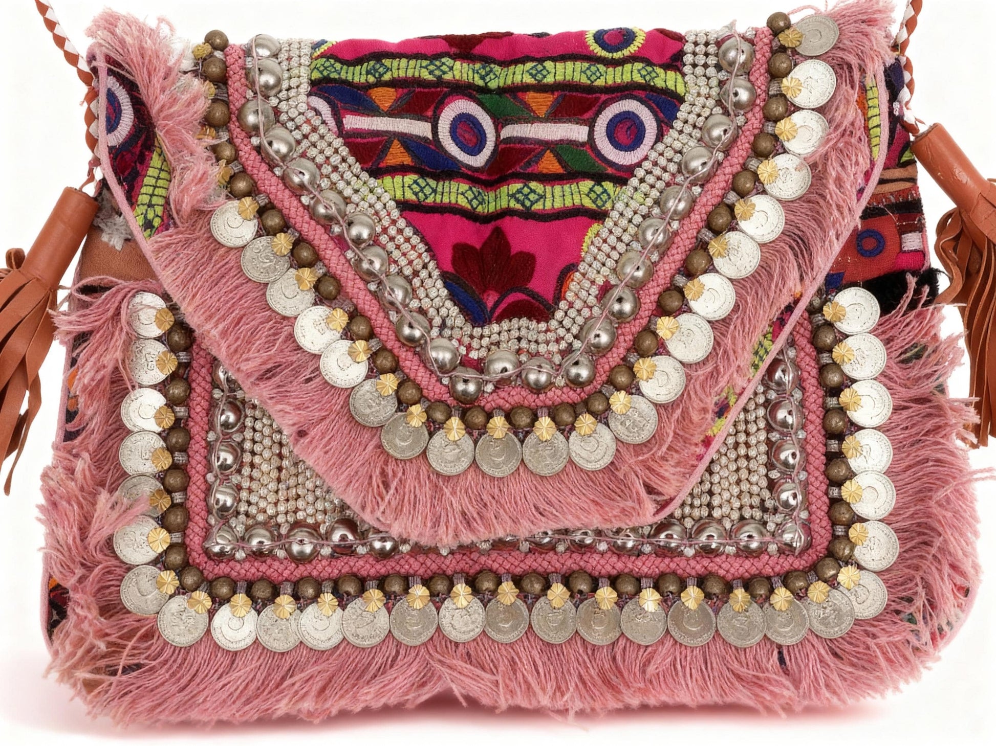 Design: The bags often feature a bohemian, Indo-gypsy fusion aesthetic. The designs frequently incorporate antique coins, fringes, and intricate beadwork.